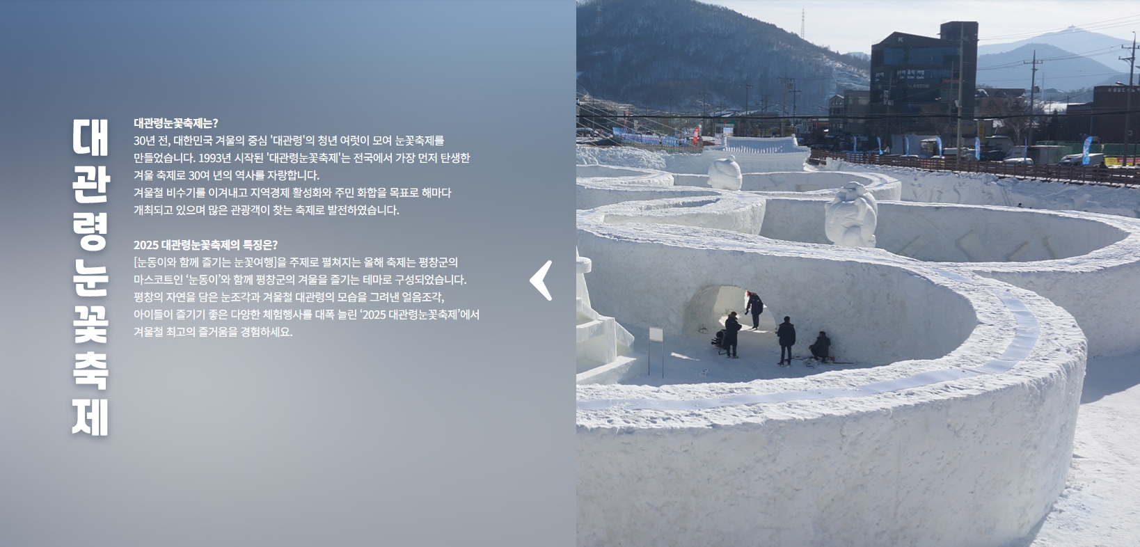 눈조각 존에서는 단순히 눈과 얼음을 감상하는 것에 그치지 않고, 관객들이 직접 참여할 수 있는 프로그램도 준비되어 있습니다. “나만의 눈사람 만들기” 체험은 아이들뿐 아니라 어른들에게도 큰 인기를 끌며, 자신만의 예술 작품을 만들어보는 색다른 즐거움을 제공합니다. 이 외에도 “눈동이 핀볼 골프”와 “새해 복투호”는 축제의 재미를 더하는 독특한 놀이들로, 대관령 눈꽃축제만의 차별화된 매력을 느낄 수 있습니다.